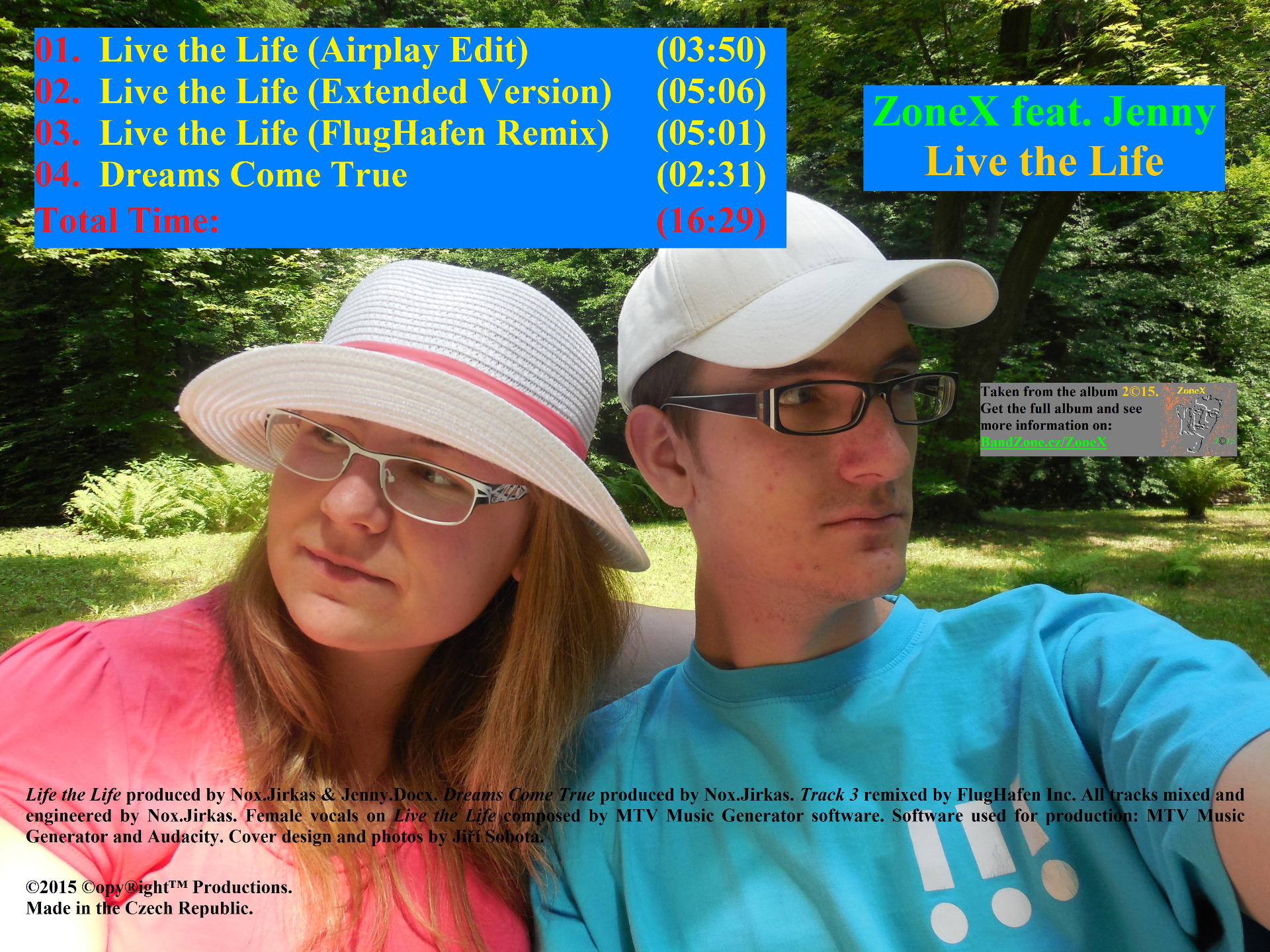 Je tady první singl ze studiového alba 2©15, ale i můj první singl vůbec, díky němuž jsem si uskutečnil svůj sen. Poslechnout si ho můžete na BandZone, a pokud upřednostňujete obrazový doprovod, tak i na Youtube. Titulní pecku Live the Life jsem vytvořil v roce 2014 společně s mou kamarádkou Domčou, která si říká Jenny. Děkuji ti za pořádnou dávku inspirace, Domčo, spolupráce s tebou mi otevřela oči! Vidím, že se písničky dají dělat i uvolněnějším způsobem. ;-)